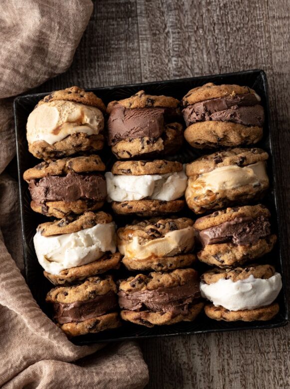 Ice cream sandwiches come in all shapes, from rectangular to round to square, and sizes, including mini, regular, and super size. Classic ice cream sandwiches are made with ice cream and two chocolate wafers. Modern versions may have frozen custard, gelato, and soft serve sandwiched between any kind of cookies.