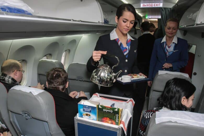There’s a reason crew members never drink coffee or tea on a plane, and neither should you. In-flight beverages are made using tap water, which, on many planes, is downright filthy. According to flight attendants, the tanks that store water on planes are rarely cleaned, and the ports to empty the toilets and refill drinking water are near each other and can cross-contaminate when serviced at the same time.