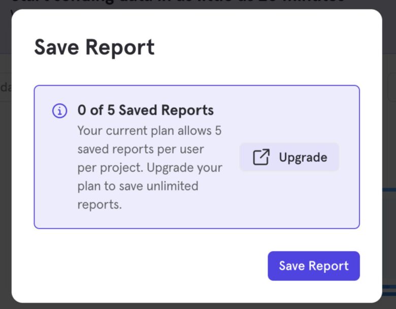 If you are a free user of Mixpanel, you can only save 5 reports. Every time you save a report, the product shows you this limit and prompts you to upgrade to a paid plan to get unlimited reports.