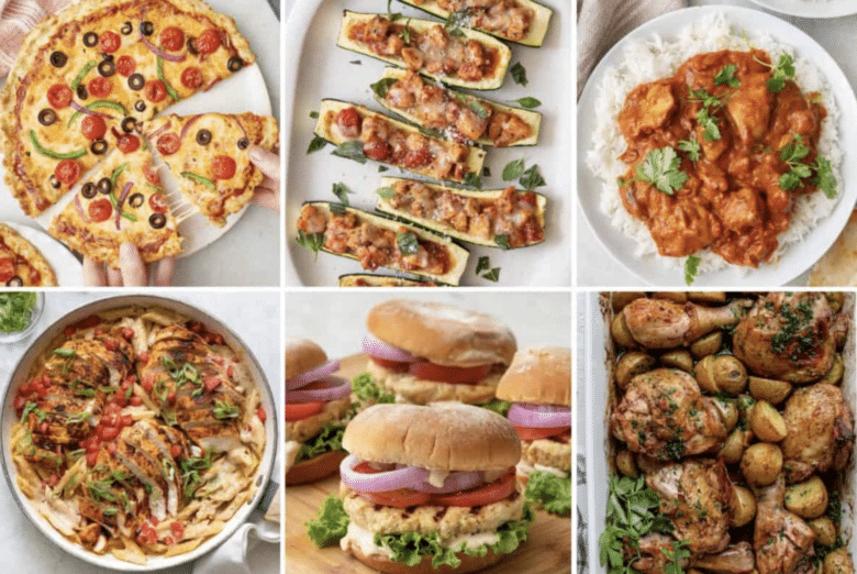 - Chicken Crust Pizza – One of my favorite healthy dinner recipes with chicken is this high-protein, flourless pizza. The crust is made out of chicken breasts and topped with all your favorite toppings.
