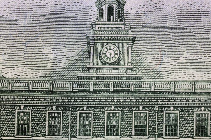 The clock in the steeple of Independence Hall on the back of the $100 bill is set to 4:10.