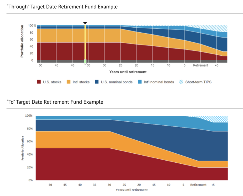 For a better understanding of these differences, look at these two charts. Target date funds which transition “through” retirement to shift their holdings as part of a glide path toward a more conservative mix, even after retirement age.