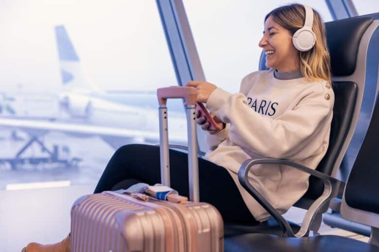 You might have the image of Audrey Hepburn or Gregory Peck for the vibe you want to portray while flying, but you’ll be more comfortable in clothes that move easily and don’t restrict you. And really, no one cares what you wear on a plane! Bring a scarf to cover up with if that frigid air freezes you out.