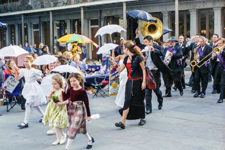 A wedding procession crosses Jackson Square in New Orleans, photographed on Kodak Gold 200 film.