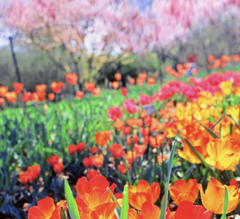 Tulips and cherry blossoms in bloom at the Brooklyn Botanic Garden, photographed on Velvia 100.