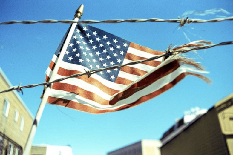 An American flag caught on barbed wire, photographed on Fuji Provia 100F and cross-processed.