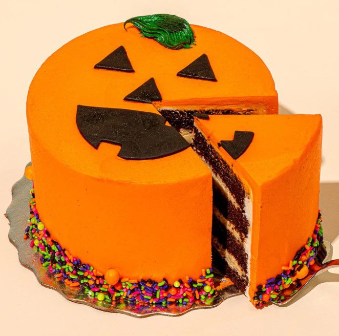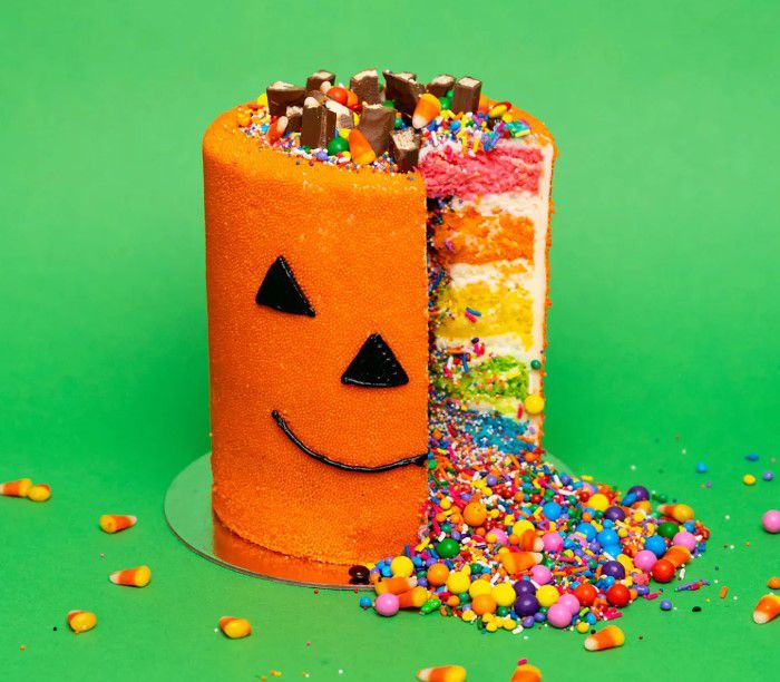 New York’s Flour Shop has become renowned for its famous Explosion Cakes, which are filled with candy, sprinkles, and other goodies that “explode” out of the center of the cake when it’s sliced., Just for Halloween, this colorful Rainbow Explosion Cake is all dressed up like a jack-o’-lantern, topped with Halloween candy, and filled with goodies.