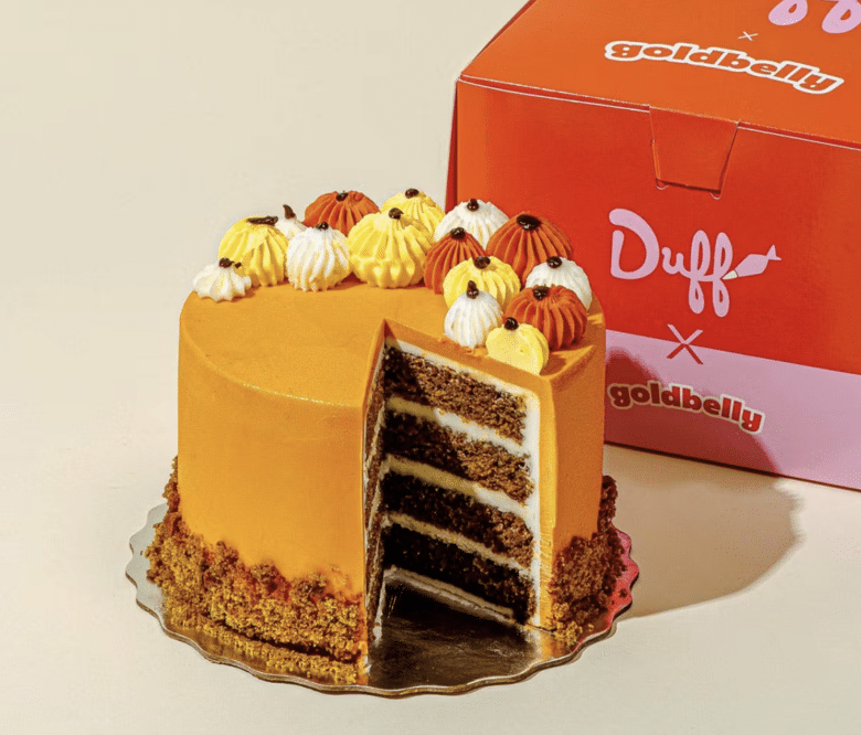 From Food Network star and “Ace of Cakes” Duff Goldman, this beautiful 4-layer Pumpkin Spice Cake has vanilla cream cheese filling and frosting. In true Goldman fashion, it’s whimsically decorated with frosting pumpkins on the top and a pumpkin crumb layer on the side!
