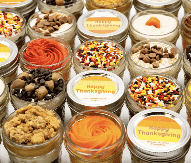 This Thanksgiving, every guest can get their very own mini cake jar! Flavors include Chocolate Pumpkin Cheesecake, Cookie Dough, Fudge Brownie, Brown Butter Pumpkin, and Cinnamon Spice Cake, and they’re all decked out for the holiday.
