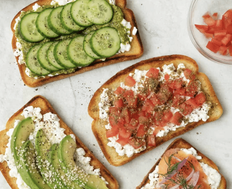 These savory cottage cheese toast recipes pair cucumbers with pesto, tomatoes with za’atar, smoked salmon with dill, and avocado with sesame!