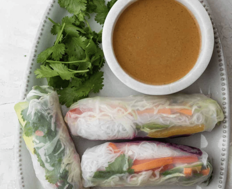 These Vegetable Spring Rolls are full of colorful veggies rolled up in Vietnamese rice paper and served with a creamy peanut sauce for a fun appetizer idea!