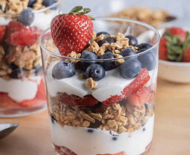 This easy and delicious fruit and yogurt parfait layers juicy strawberries, creamy Greek yogurt, fresh blueberries, and crunchy granola in every bite!