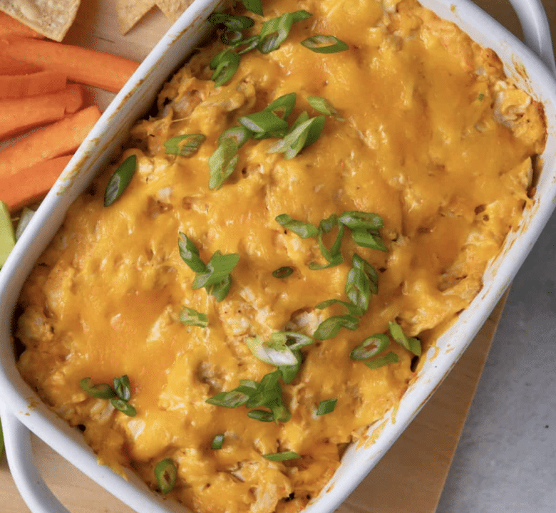 This Buffalo Chicken Dip is the perfect game day appetizer. You’ll love this cheesy, spicy chicken dip with chips, veggies, and more!