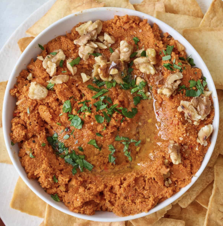 Muhammara is a Middle Eastern vegan dip that’s made with walnuts, roasted red peppers, breadcrumbs, olive oil and spices – easy to make in ONE simple step!