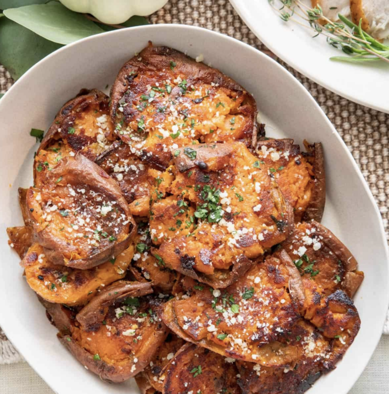 Crispy smashed sweet potatoes roasted in the oven with savory spices and parmesan cheese! A way to cook sweet potatoes that actually yields a crispy outside!