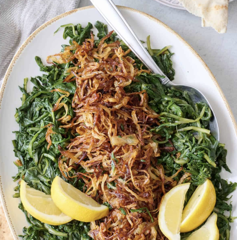 Middle Eastern Dandelion greens, called Hindbeh are cooked down and topped with crispy fried onions for an extra special touch!