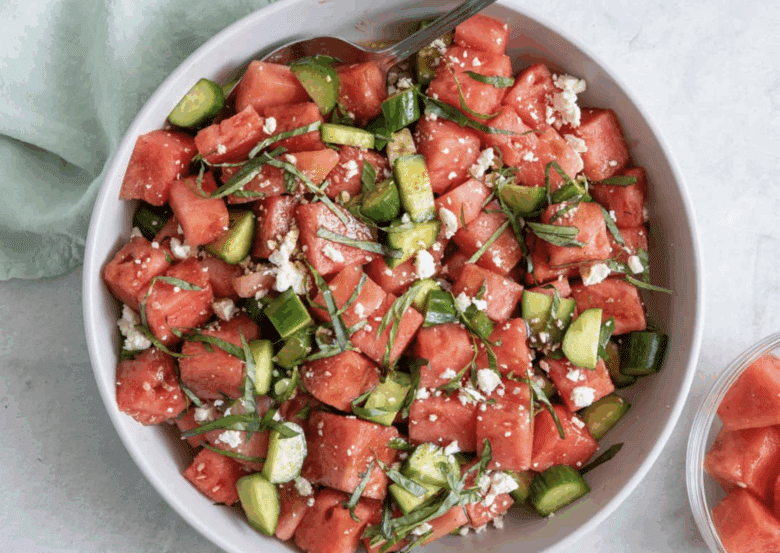 Watermelon Cucumber Salad tossed with feta cheese and a light balsamic vinaigrette. Topped with fresh basil and feta, takes 10 minutes to throw together.