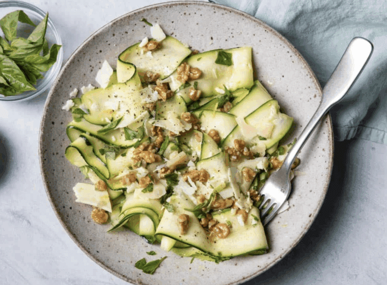 This zucchini salad recipe is made with raw zucchini ribbons, walnuts, and shaved parmesan. It is tossed in a homemade lemony dressing.