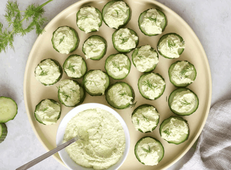 Cucumber bites are a quick and refreshing appetizer that I love to make for gatherings. Essentially, it’s like having veggies and feta dip, but with the dip already on the cucumber slices. This way, they look a bit fancy (if you want, you can even call them cucumber canapes) and are super easy to serve and eat.