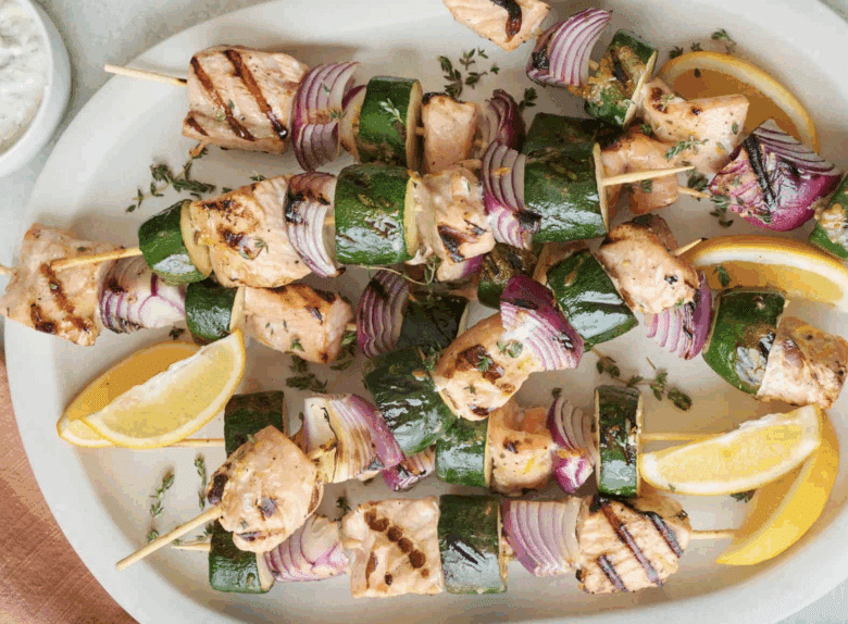 These salmon kabobs are marinated in a tangy mustard sauce and grilled with zucchini and onions. Perfect over a flame for summer grilling!