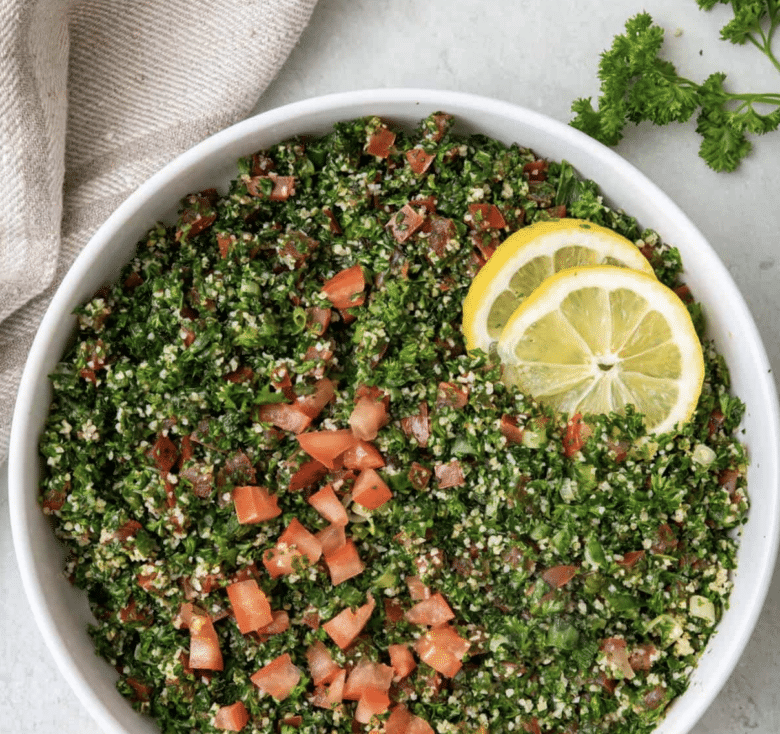 This traditional Lebanese Tabbouleh Salad recipe is a healthy vegan Mediterranean appetizer made with bulgur, parsley, mint and chopped vegetables.