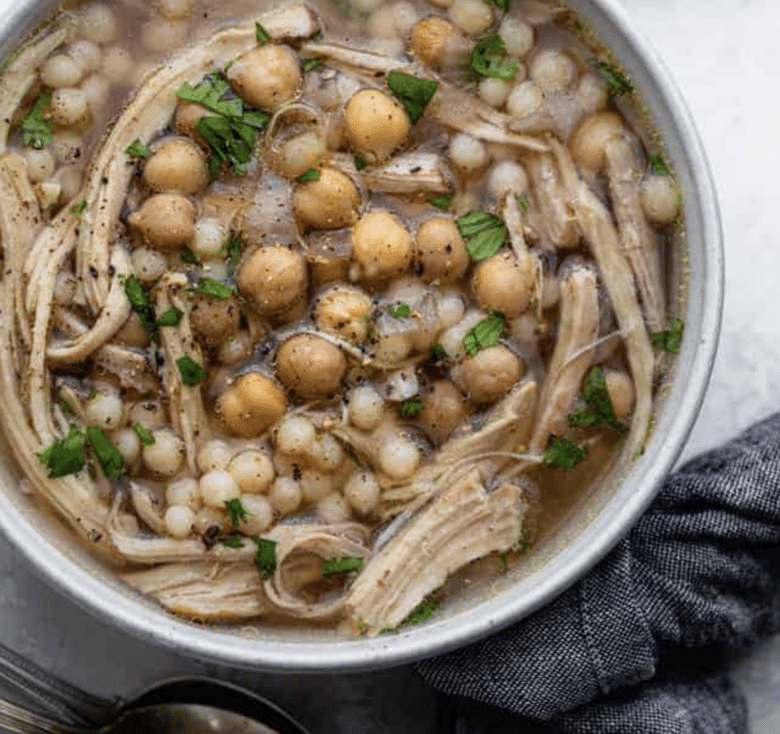 Moghrabieh is a traditional Lebanese stew and is a firm family favorite. High in protein, this hearty, healthy stew is wonderfully spiced and full of flavor