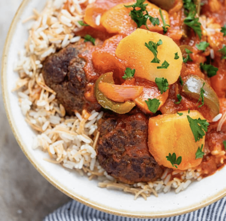 This traditional Lebanese kafta and potato stew is a hearty meal that the whole family will love! Seasoned patties/meatballs are cooked in a rich tomato sauce for a healthy and delicious meal.