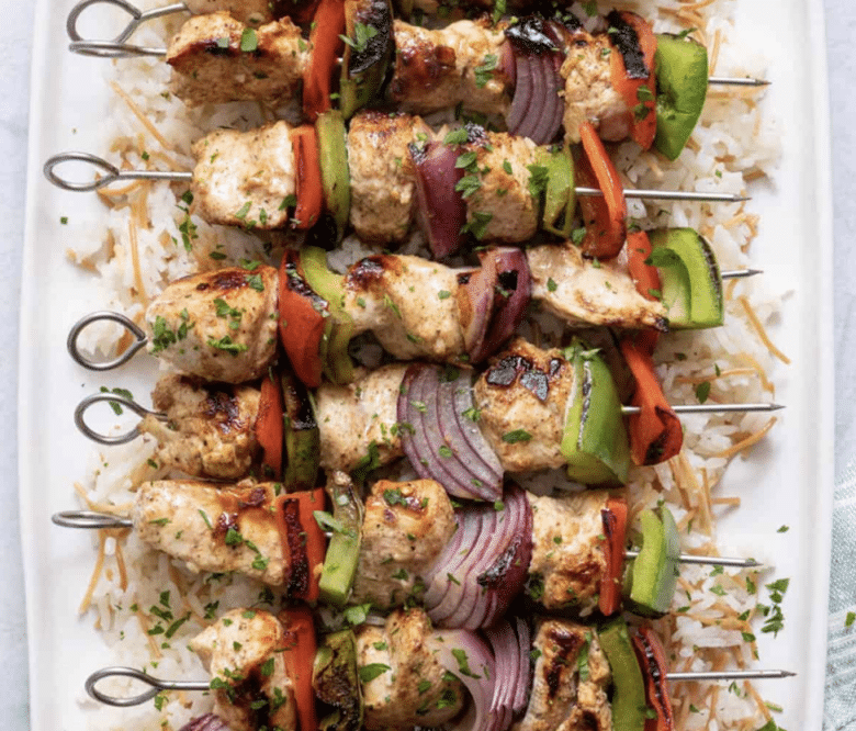 These Grilled Chicken Shish Kabobs are flavorful & easy to make! The chicken is marinated with bright Mediterranean spices on a skewer with fresh veggies.
