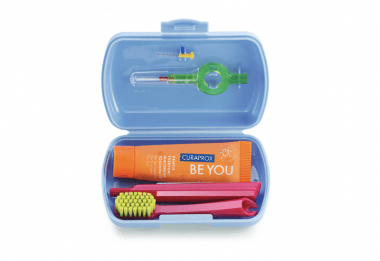 If your bag is tight on space, pack this tiny Swiss-made toothcare kit. It contains a two-piece toothbrush, Peach+Apricot flavored whitening toothpaste, and two interdental brushes, nestled in a small, protective case. I keep one in my carry-on for freshening up before I depart the plane.  It’s also great for camping!
