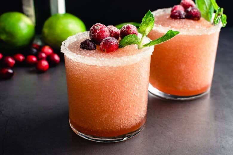 These amazingly refreshing cranberry margaritas have the perfect balance of sweet and tart flavors. The easiest and prettiest Thanksgiving tequila drink your guests will really enjoy!