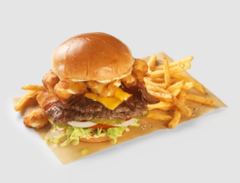 Chow down on two patties, American cheese, cheese curds, bacon, mayo, chipotle seasoning, and lettuce, tomatoes and onion thrown in for good measure. What doesn’t this massive burger have?