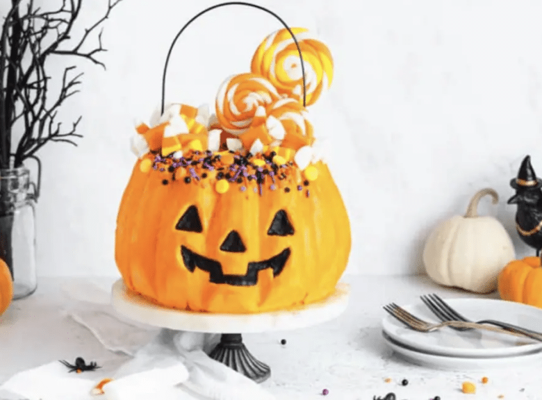 This adorable jack-o-lantern pumpkin cake bucket is perfect for Halloween parties or just as a fun and festive treat! The cake is shaped like a classic pumpkin bucket, complete with a scary face carved out. Whether you’re a baking pro or just love to indulge in sweet treats, this festive cake is sure to be a hit.