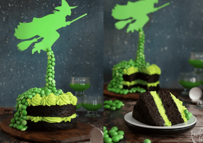 You’ll have everyone “Defying Gravity” With this Wicked inspiration cake! It’s perfect for a good haunting table spread at your home, or to bring to Halloween bake off! It’s spell binding!