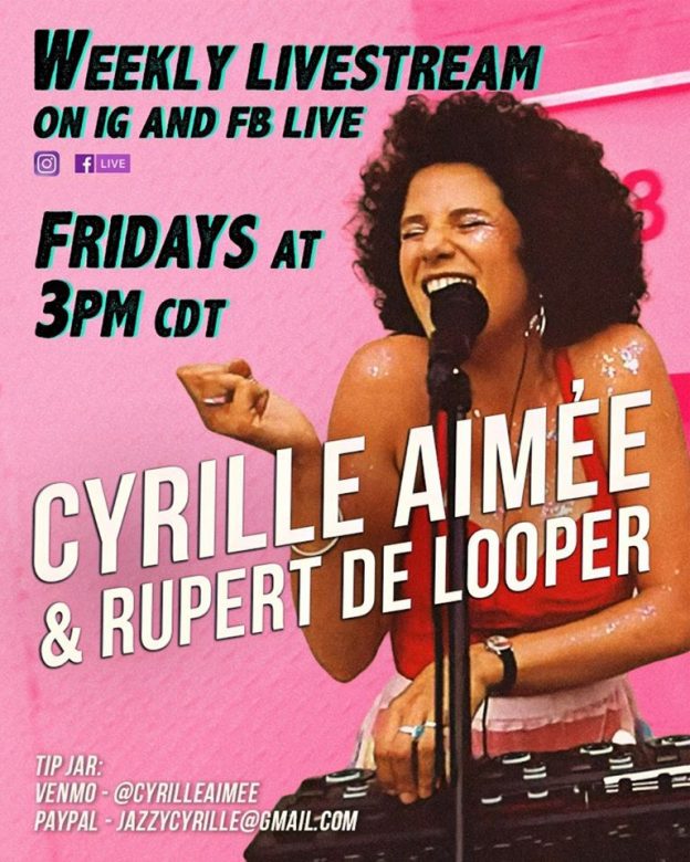 Grammy-nominated jazz vocalist Cyrille Aimée is broadcasting live from her home every Friday. She performs with a loop station she calls Rupert de Looper to promote her new record, Just You, Just Me. Based in New Orleans, Aimée’s accolades include winning the Montreux Jazz Festival Vocal Competition and the Sarah Vaughn International Jazz Vocal Competition.