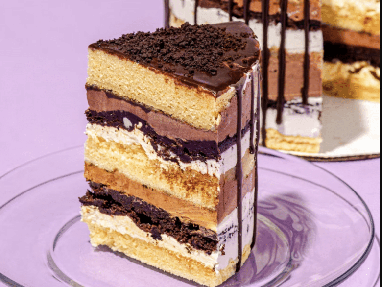 Each Gluten Free Black and White Layer Cake features 3 layers of vanilla cake and 2 layers of brownie cake. Each is frosted with alternating layers of vanilla buttercream and chocolate buttercream. It’s topped with cookie crumbs and chocolate ganache.