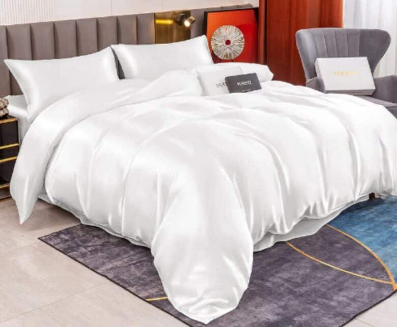 The 19Momme 4Pcs Silk Set Duvet Cover+Flat Sheet+2x Pillowcases is $449.00 and comes in sixteen colors: white, champagne, pink, black, wine, dark blue, silver, gray, pale mauve, khaki, teal, coffee, light blue, beige, lavender, and mint green. There’s five sizes: twin, full, queen, king, and cal.king. It’s made from 100% Grade A mulberry silk.