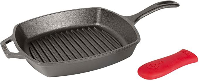 An Amazon’s Choice for “best bacon skillet”, this 10.5-inch square grill pan is pre-seasoned to prevent food from sticking and outfitted with a removable red silicone hot handle holder.