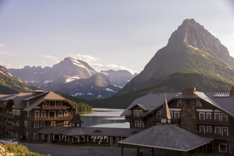 Grinnell Point looms over Swiftcurrent Lake behind Many Glacier Hotel, another popular destination inside the park.