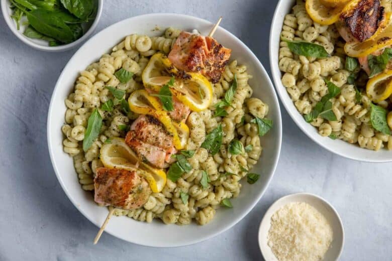 - Pesto Grilled Salmon – Salmon kabobs brushed with fresh summery pesto before being grilled to perfection. Serve with parmesan pesto pasta for one of the tastiest kid-friendly summer dinner ideas.