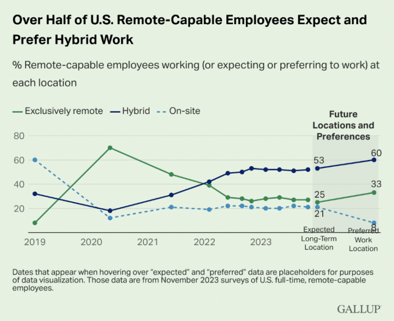 Having the flexibility works well for most employees with remote-capable jobs. Statistics from Gallup show that 60% want to work off-site for part of the week. About one-third don’t want to go back to the office at all.