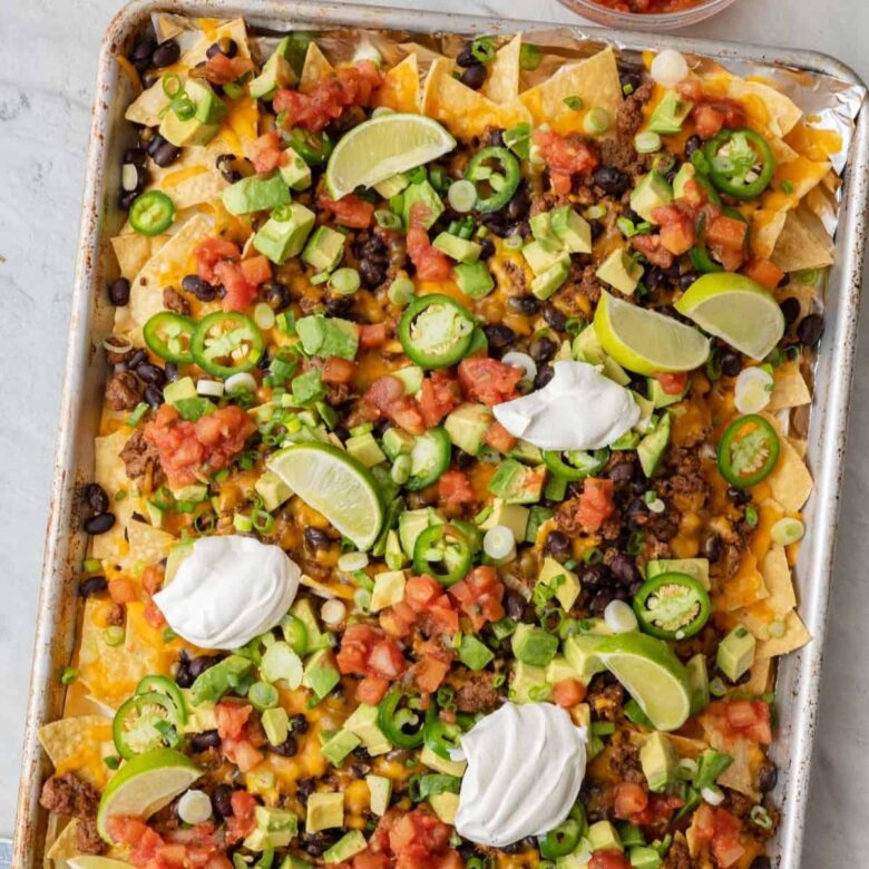 • Sheet Pan Nachos – This unique dish has layered crispy tortilla chips with beef, beans, and cheese and loaded with all your favorite toppings. It’s the ultimate way to serve nachos for a crowd!