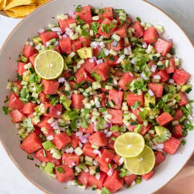 • Watermelon Salsa – Take your salsa to a new level with this refreshing and vibrant watermelon pico de Gallo recipe. It’s made with juicy watermelon, crisp cucumbers, spicy jalapeno peppers, fresh cilantro, and creamy avocado. So fresh and so good!
