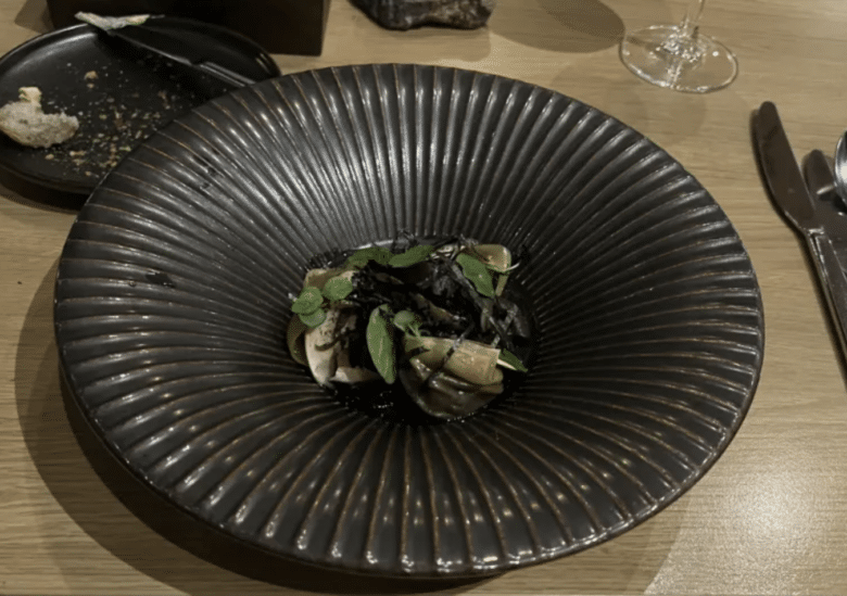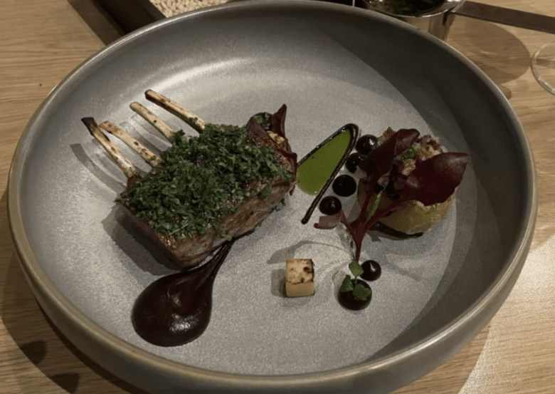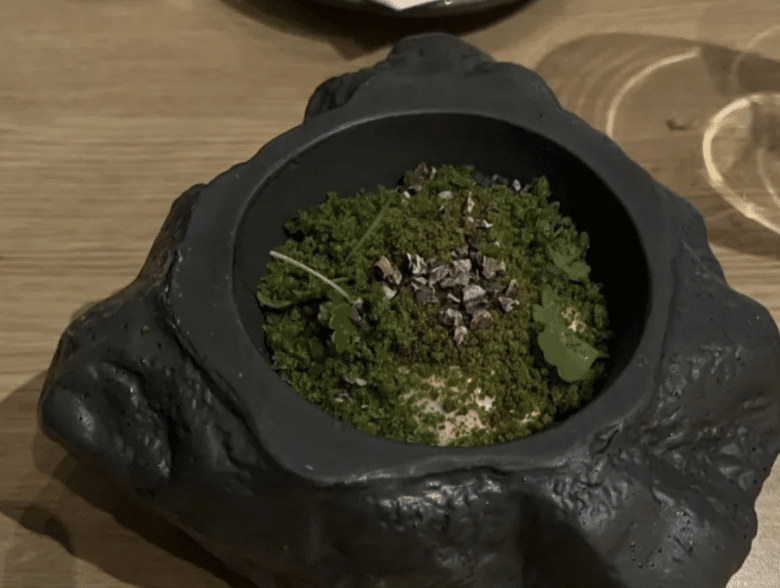 Chef Ingo’s horse tataki dish combines Asian and French cooking techniques, with horsemeat as the culinary canvas. His horse tataki sits on a foundation of barley sourdough brioche grilled in brown butter, a layer of stewed onions, and pickled Icelandic moss, topped with a spicy sauce made from Icelandic dried seafood and horse bacon and garnished with some Icelandic wasabi leaves. Chef Ingo forages many of the dish’s ingredients from the hotel’s property.