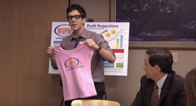 I mean, does this need further explanation? For those who don’t remember, WUPHF.com was the ill-fated brainchild of Michael’s “brainchild,” Ryan Howard. WUPHF.com was a messaging system that sent messages through Facebook, chat, SMS, fax, Twitter, and more. However, the idea was DOA, and after getting pressure from coworker investors, he finally sold it to Washington University Public Health Fund, which only wanted the company for its name.