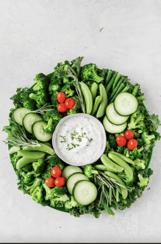For the Christmas holiday, this crudite platter wreath offers guests a festive healthy beautiful platter filled with vegetables and a homemade ranch dip!