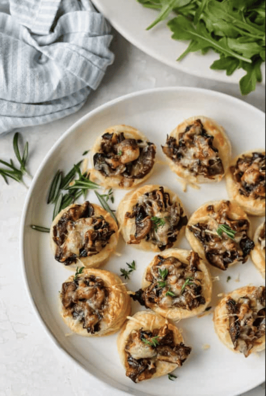 These cheesy mushroom tartlets are the perfect appetizer for holiday parties – made with onions, mushrooms and cheese on top of a buttery flaky mini pastry!