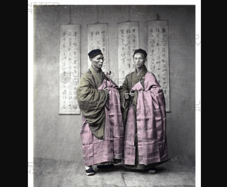 Chinese men in matching traditional dress, 1870s.