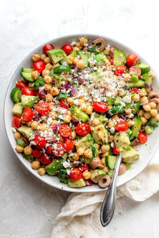 • Chickpea Salad – Loaded with fresh veggies, texture, and nutrition, this salad is one of my go-to’s when I’m looking for quick and easy sides for burgers.