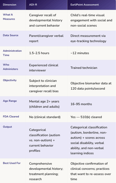 Note: EarliPoint aids clinicians in diagnosis—it complements the developmental history captured by the ADI-R, not replaces it.