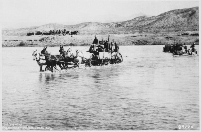 Crossing Gila River in buckboard wagons near San Carlos, Arizona, 1885